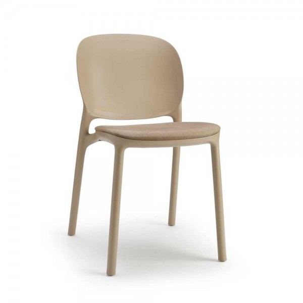 Auf Wunsch ist der Stuhl auch mit einer gepolsterten, mit Stoff bezogenen Sitzfläche erhältlich.